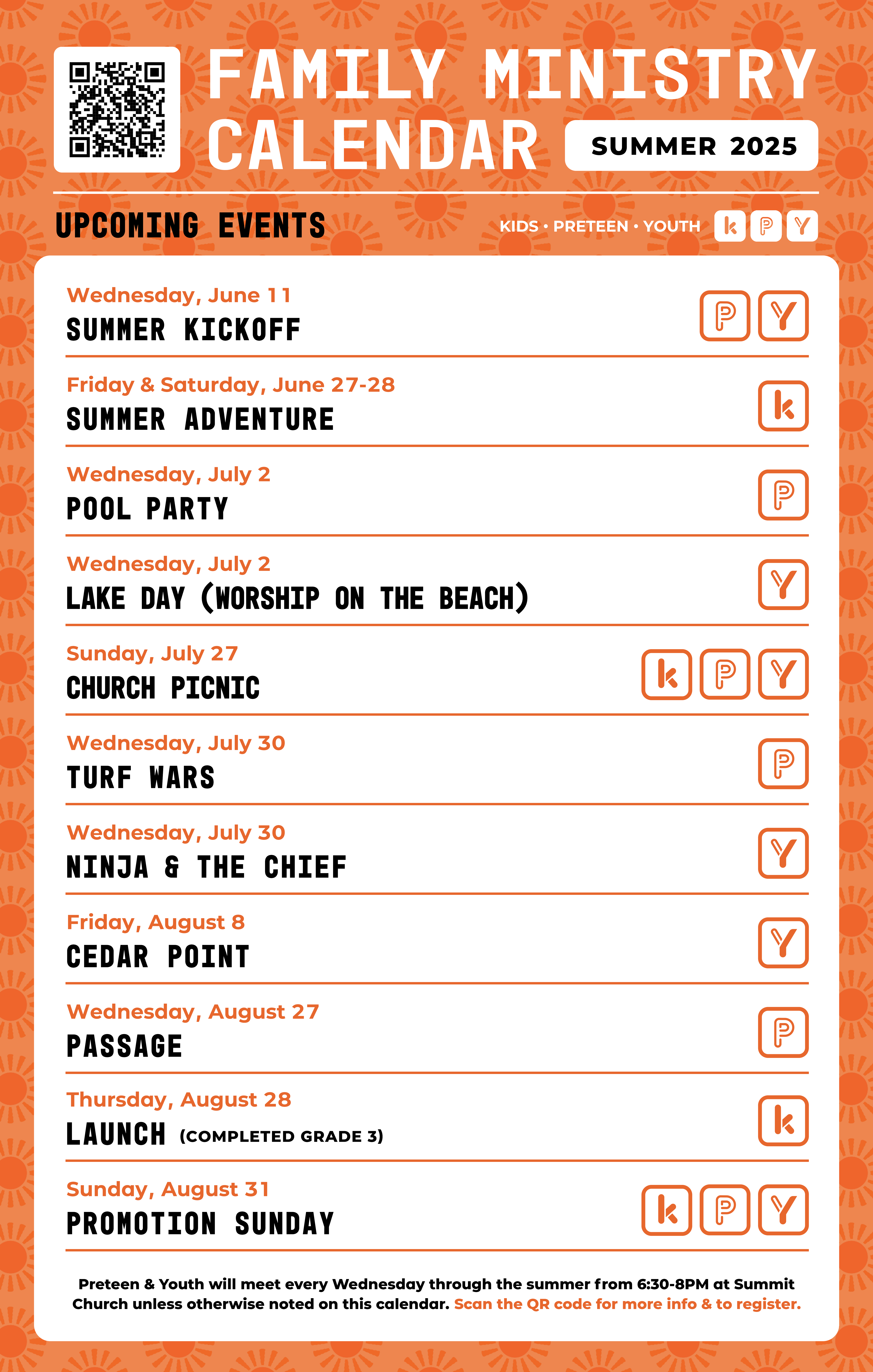 Click the link HERE to view our 2025 Fall Calendar. Events and registrations become live on our App and website before event. For questions, email pastor Chuck at chuck@summitniles.com.